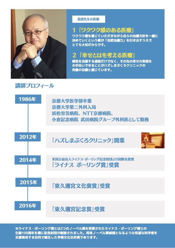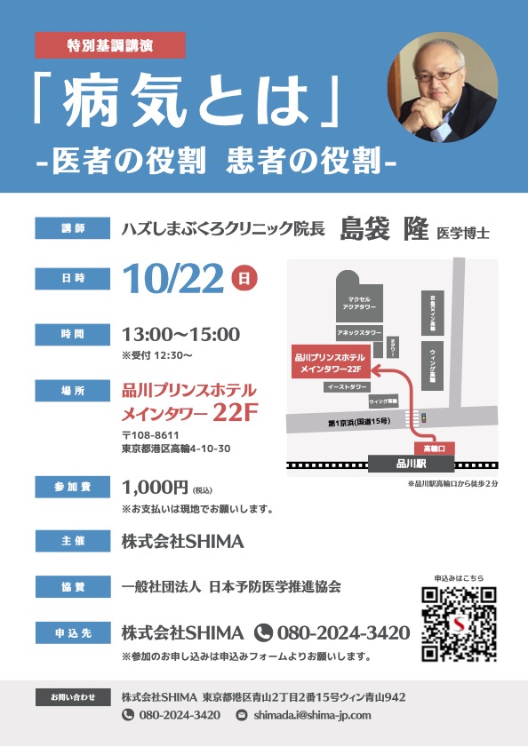 10月222023 カルシウム講座 カルシウム基調講演ハズしまぶくろクリニック 院長 島袋 隆先生 カルシウム基調講演としてお話し頂きます。病気にまつわるあれこれや、長年腫瘍外科として勤めて、行着いた考え方などを詳しくお話し頂きます。日時 10/22(日) 13:00~15:00場所 品川プリンスホテル メインタワー22階参加費 1000円